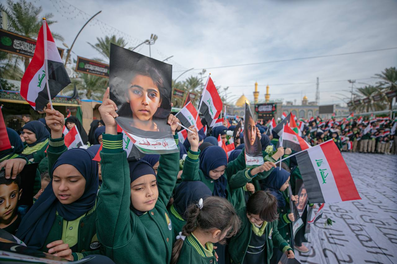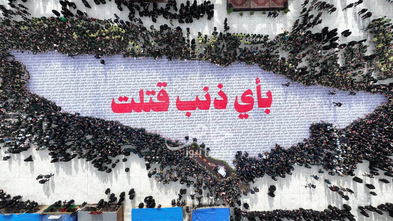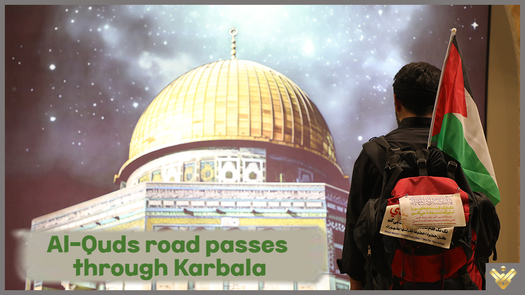 Karbala stands for Palestine. The Holy Shrines in Karbala raised the map of Palestine with the Quranic verse "for what crime they were put to death?" (81:9)